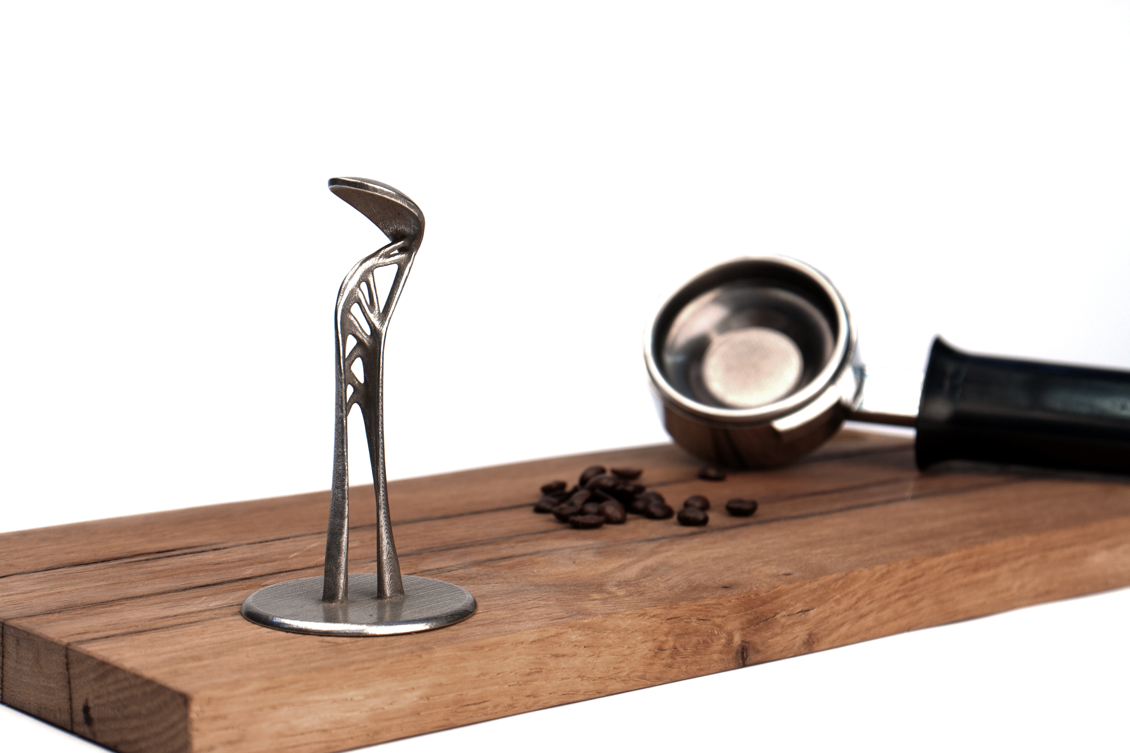 Ein 3D-gedrucktes Edelstahl-Werkzeug zum Kaffeemachen. Das Volumen ist topologisch optimiert, um Material und Kosten zu sparen. Aus einer Notwendigkeit heraus entstand so eine ungewöhnliche Form, die amorph und technisch zugleich anmutet.